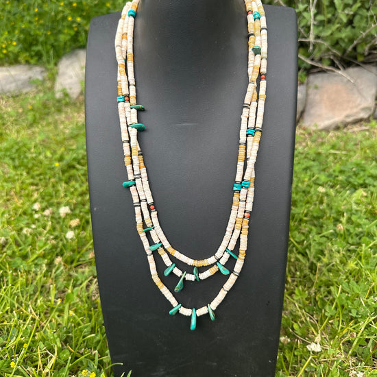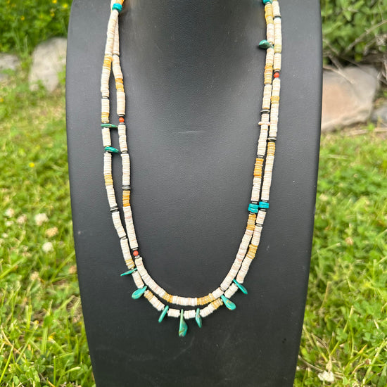 Perfect to wear alone or layer up with silver or our 1 strand offering. It has sterling fasteners, turquoise, spiny oyster, shell and sterling silver beads throughout. 22 inches in length.