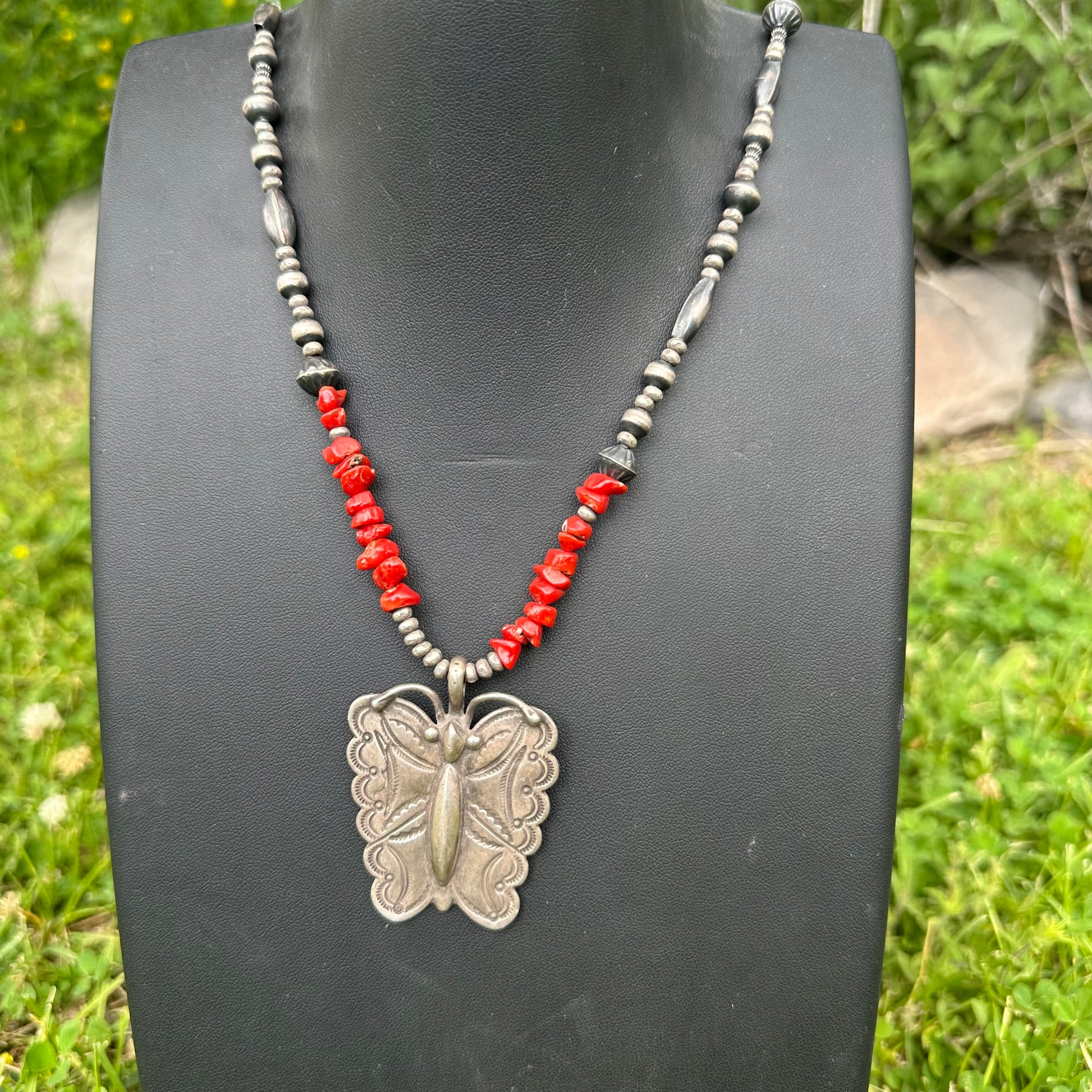 Coral and sterling silver bench bead, one of a kind, butterfly necklace, by the artist Buffalo of Taos. Impeccable craftsmanship and collectible piece. Necklace measures 28 inches.