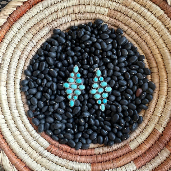 These turquoise clusters are oh so unique in the diamond shape. Lightweight & lovely. They measure 1 3/4 inches long and about 1 inch wide. Very, very wearable.