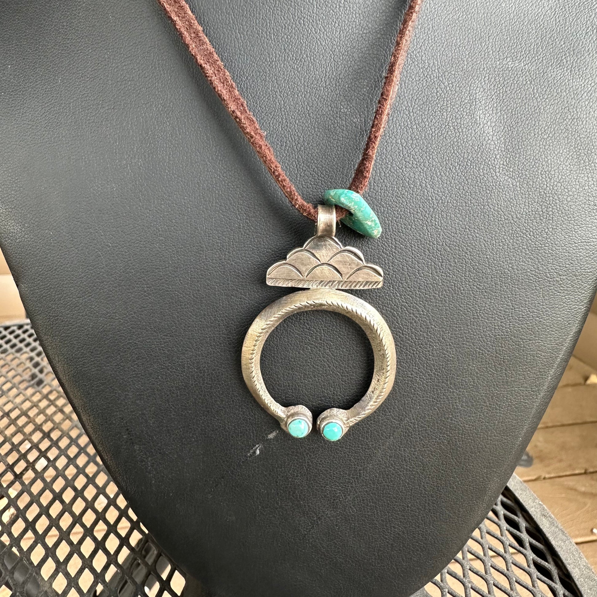 Well we sure do love rain clouds around here...and also Jessie Robbins! This naja measures w inches with a fully adjustable leather necklace. Jessie mines his own Cheyenne turquoise and forges his silverwork.