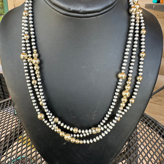 This strand features one large gold-plated bead spaced out around the strand...stack em up! adjusts from 18-20 inches.