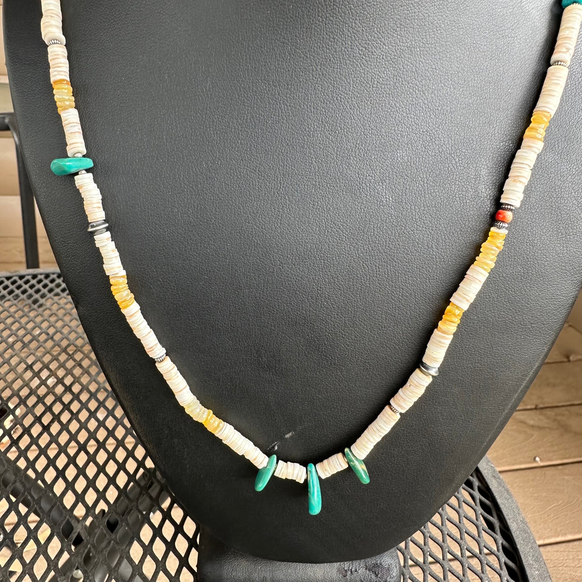 This shell and gemstone necklace is just perfect layered with our two stand or standing alone. Features turquoise, spiny ouster, shell and sterling silver beads. The necklace is 25 inches long.