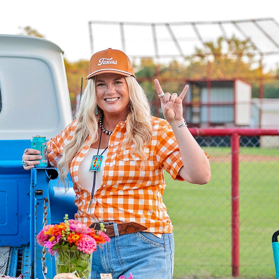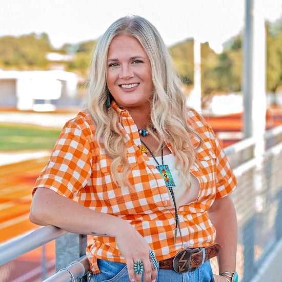 Meet your new game day shirt! Our Women’s Short Sleeve Fishing Shirt in Burnt Orange Check blends bold school spirit with flattering, functional design—so you can rep your team in comfort and style.