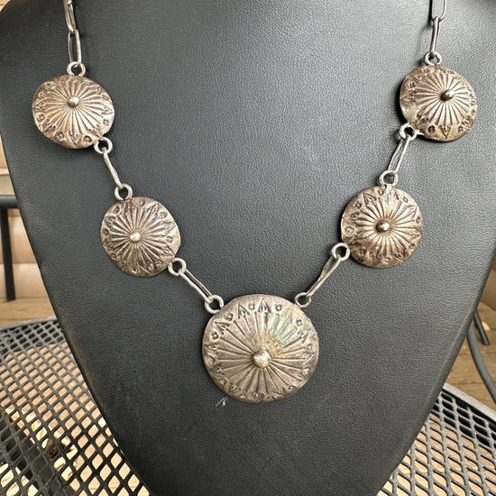 So vintage and so good! You just can't make new old stuff. The links are handmade paperclip style and the conchos are hollow domes with hand stamped work. 24 inches at the longest, but easily fastened shorter. Lightweight but exceptional.